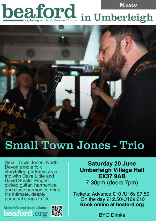 Small Town Jones, North Devon’s indie folk storyteller, performs as a trio with Dave Little and David Smale. Finger picked guitar, harmonica, and close harmonies bring his intimate, deeply personal songs to life.